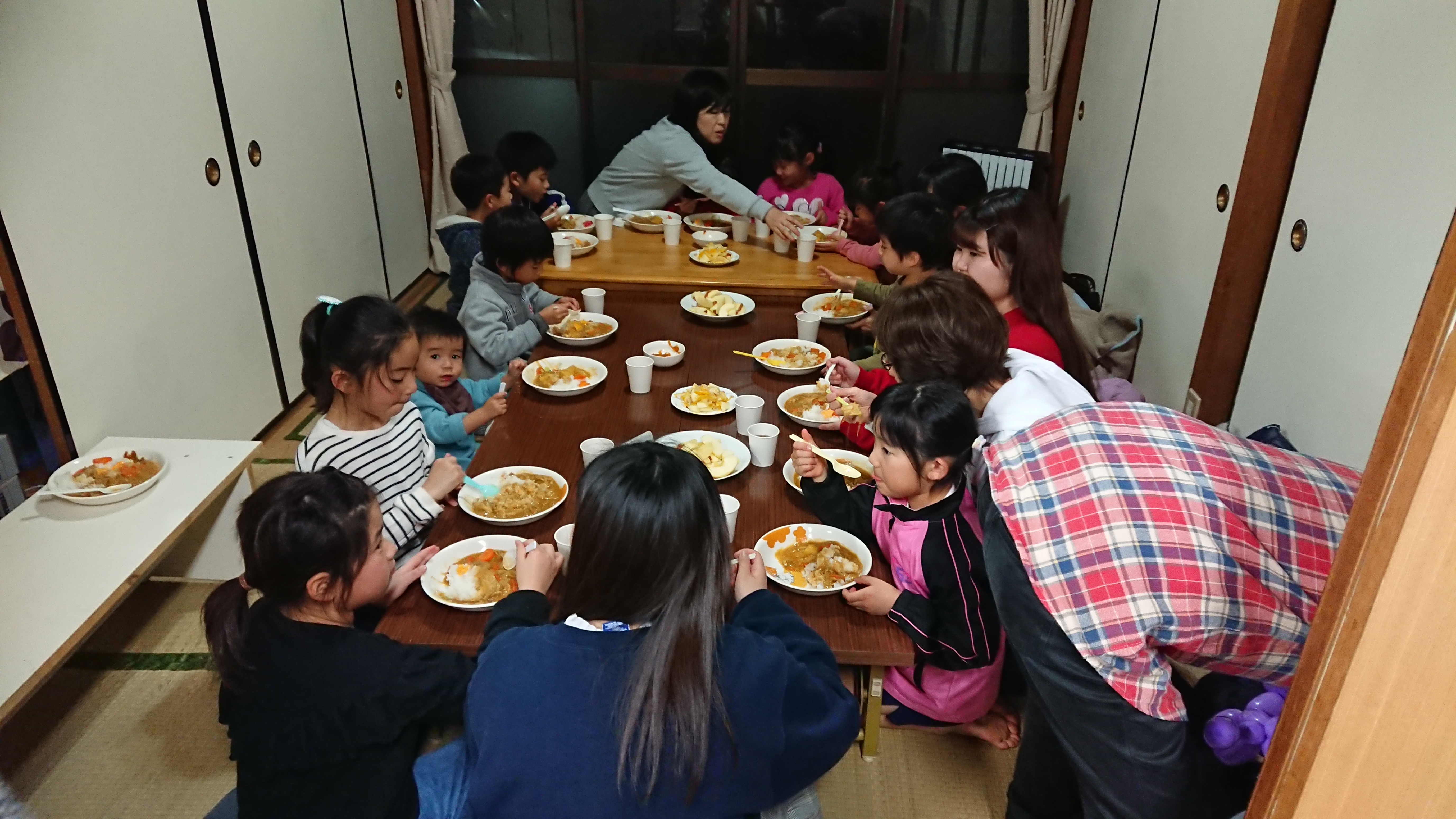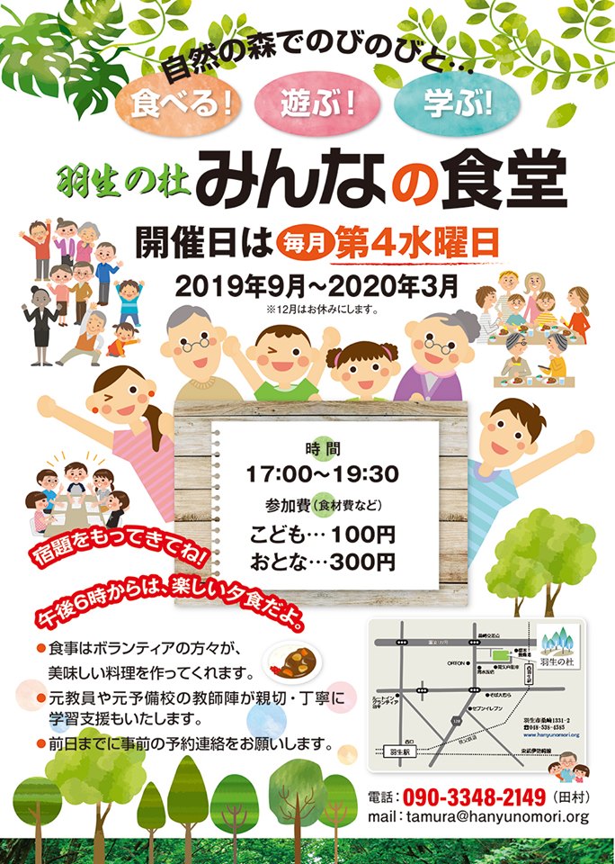 自然の雑木林でのびのびと子どもから大人、高齢者、外国人家族など誰もが集う「みんなの食堂」です。お弁当のテイクアウトと食卓を囲む食堂の併設。何人申し込んでも一家族最大500円です。