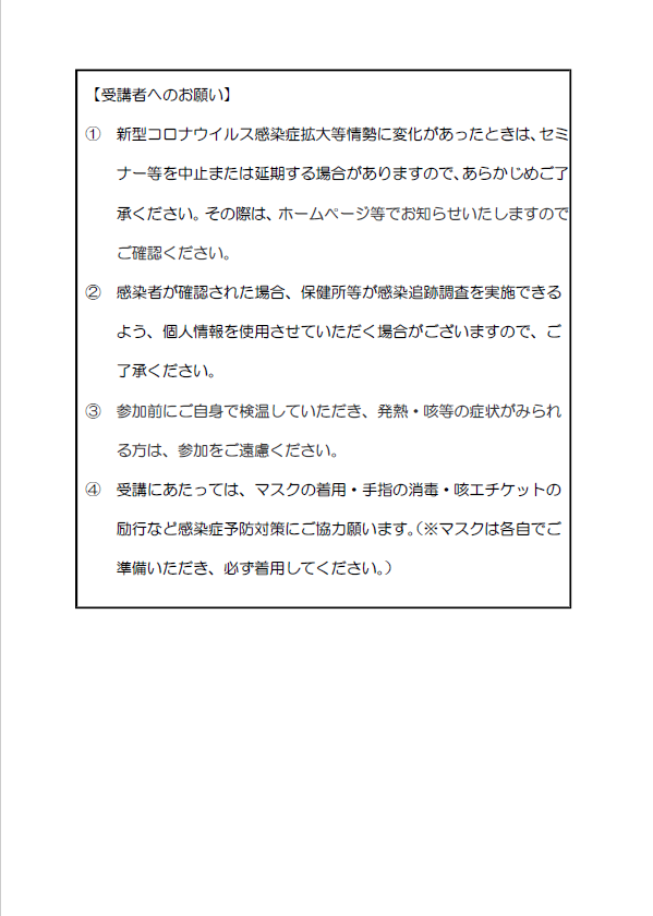 ・受講にあたっては、マスクの着用・手指の消毒・咳エチケットの励行など感染症予防対策にご協力願います。(※マスクは各自でご準備いただき、必ず着用してください。)