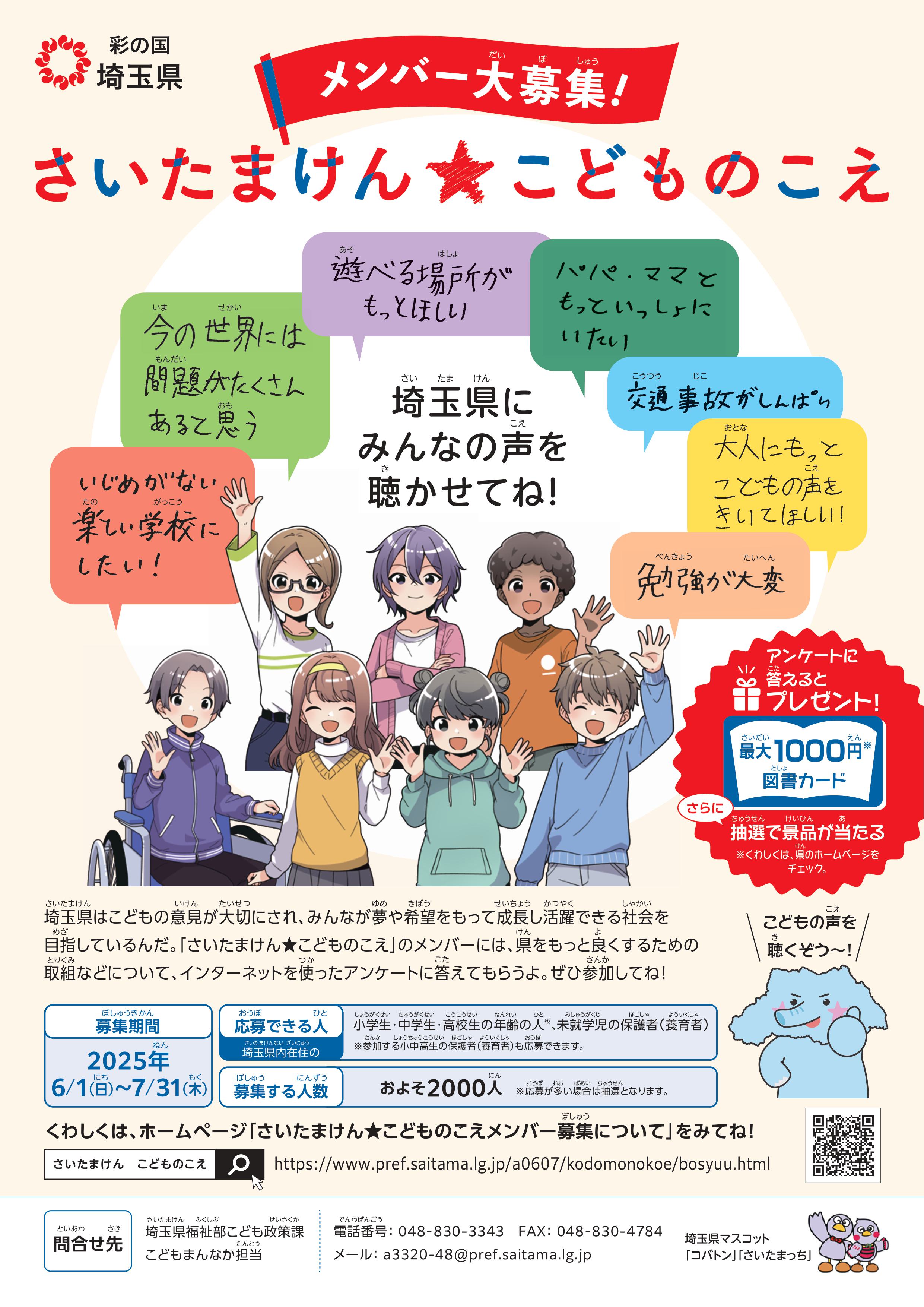 埼玉県では、こどもの意見が尊重され、皆さんが夢や希望をもって成長・活躍できる社会の実現を目指していま...